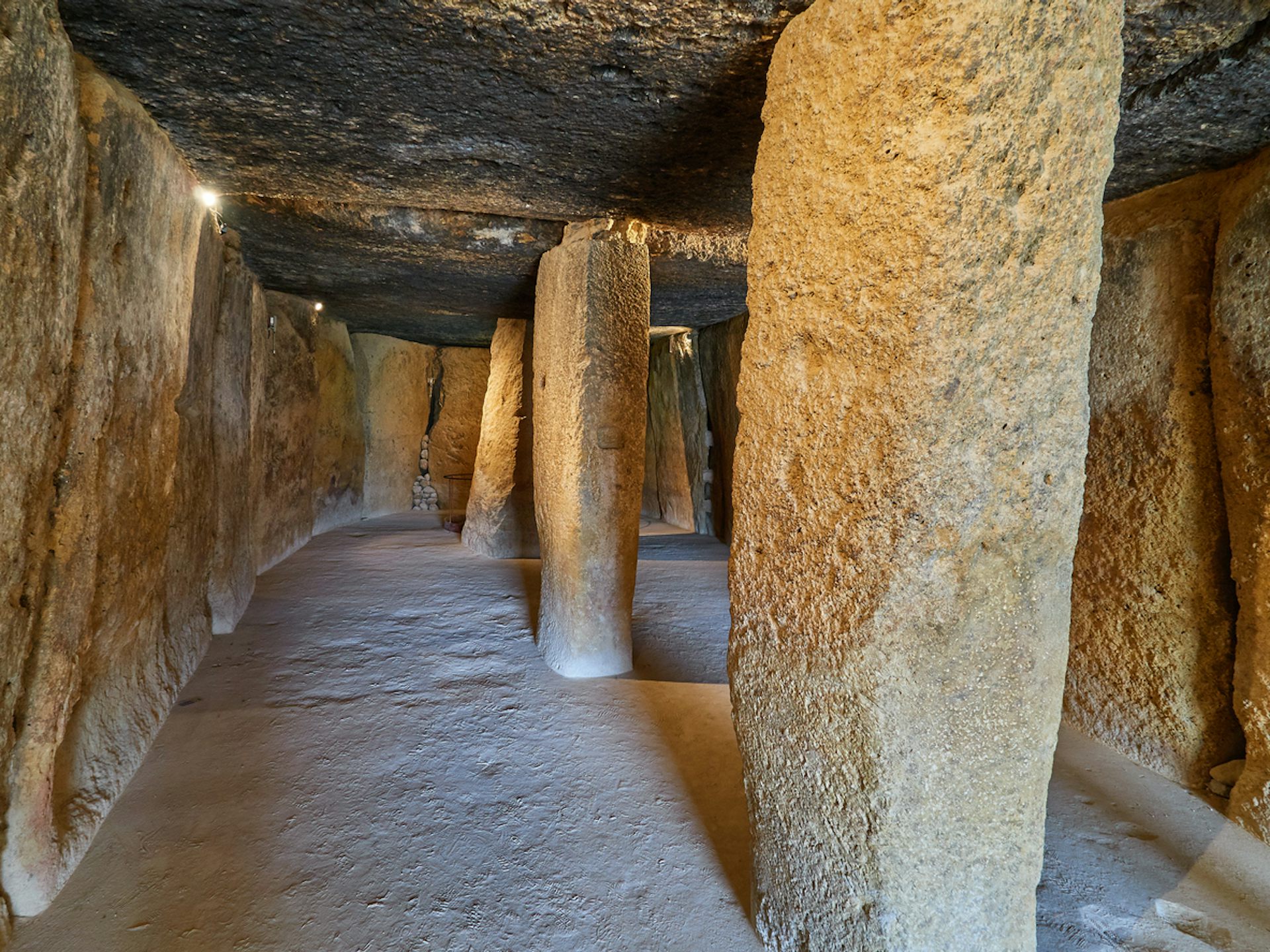 El Dolmen de Menga (o Cueva de Menga) data del 3800-3600 a.C. y fue utilizado como tumba colectiva y santuario. Su cámara principal, cubierta por enormes losas, demuestra un conocimiento avanzado de la mecánica, la orientación solar y la acústica. Estudios recientes (2024-2025) confirman que fue diseñado con precisión para alinearse con el solsticio de verano. Es un testimonio vivo de la transición del neolítico al calcolítico en la Península Ibérica.