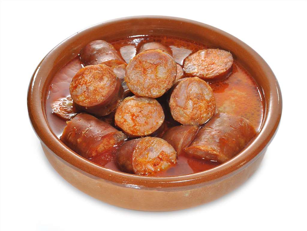 El chorizo al vino se cocina lentamente en grandes tarteiras de barro, lo que le da una textura tierna y un sabor profundo al vino tinto. Acompañado de cachelos y orella, es un plato reconfortante típico del verano gallego rural.